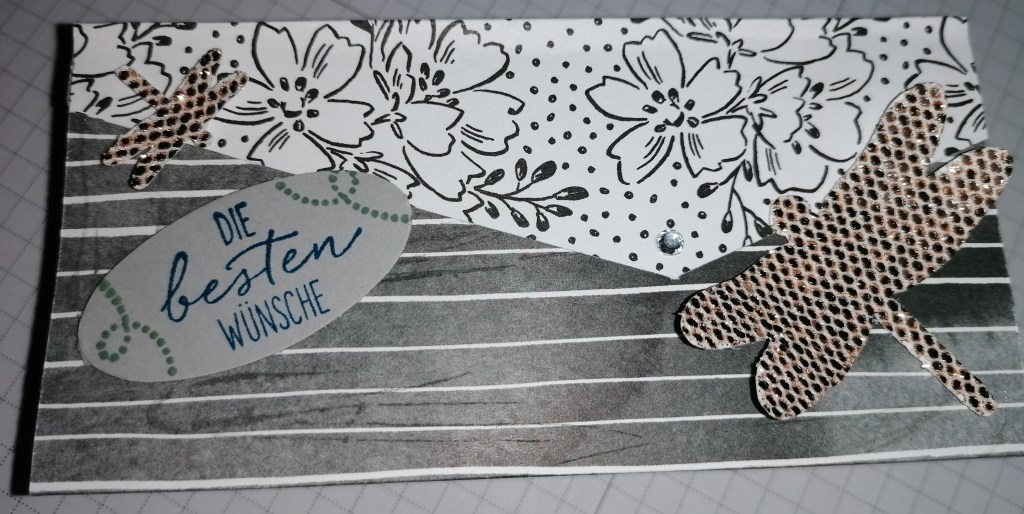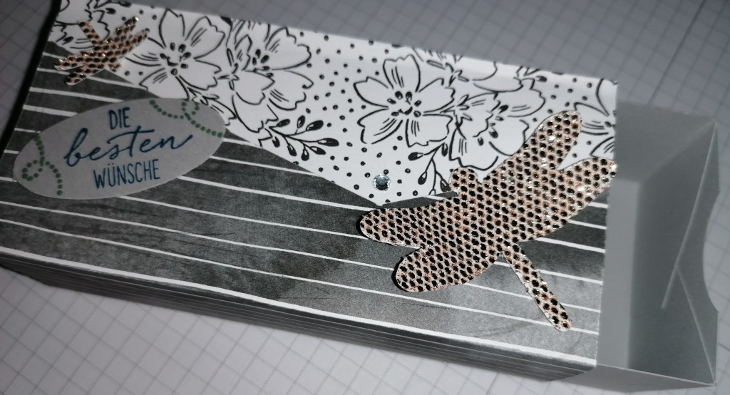 Und nun geht es an´s Dekorieren…*Freu* Hierzu habe ich mit der Handstanze Libellen aus dem Spezialpapier „Glamour“ ausgestanzt und mit Dimensionals aufgeklebt. Auf ein Rest Cardstock den Spruch “ Die besten Wünsche“ aus dem Stempelset „Wünsche aus dem Garten“ in Pazifikblau aufgestempelt und mit der Ovalen Doppelstanze ausgestanzt. Natürlich kannst Du auch eine andere Stanze oder Framlits verwenden 😉 Die Verzierung ist aus dem selben Stempelset und in Lodengrün abgestempelt. Auch diese habe ich mit Dimensionals aufgeklebt. Zum Schluss habe ich noch ein Strass-Schmuck als „Knopf“ aufgeklebt. Natürlich kannst Du es nach Deinen Wünschen Dekorieren. So, ich hoffe ich habe es halbwegs verständlich erklärt, solltest Du Fragen haben melde Dich einfach bei mir. Ich wünsche Dir viel Spaß beim nach basteln. Bis bald