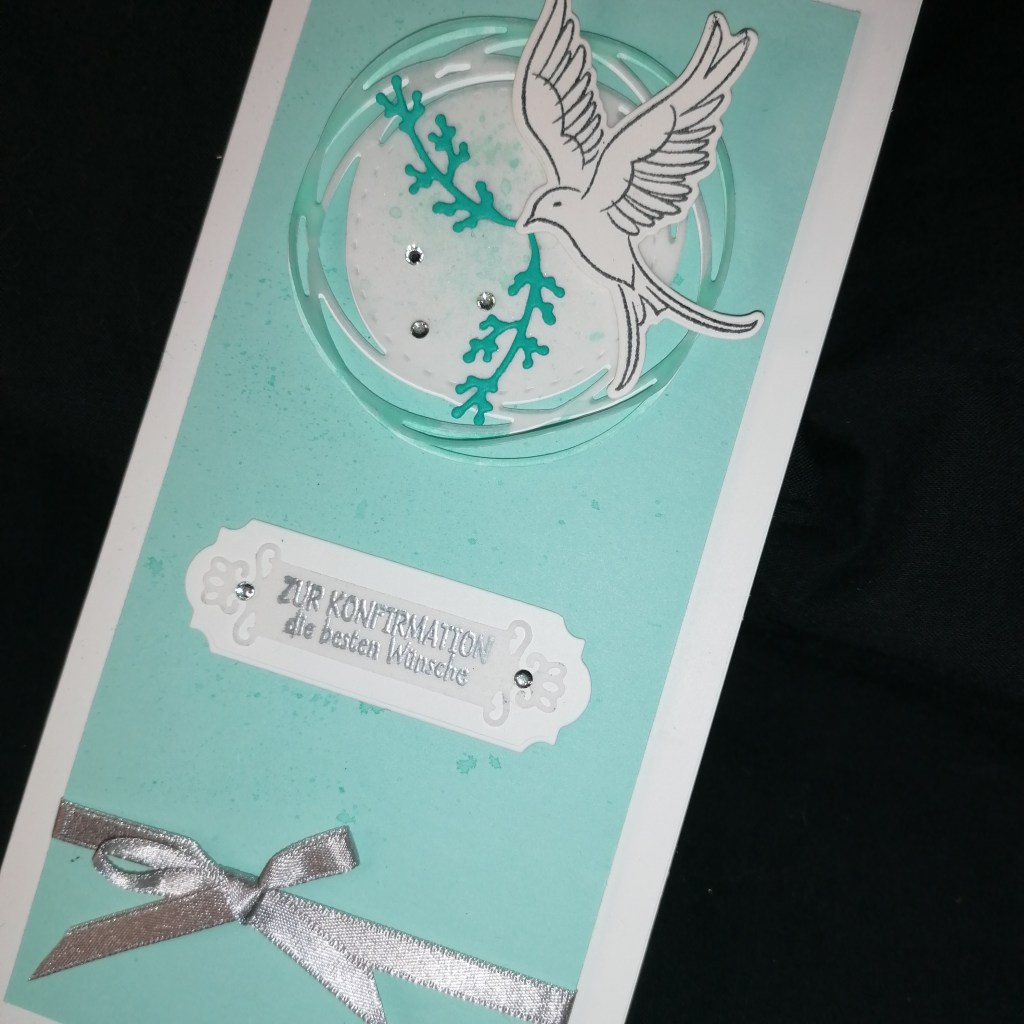 Ich habe mich für eine Slimline Karte entschieden in Grundweiss. Dazu ein Aufleger in Aquamarin den ich in Jade mit dem Wassertankpinsel bespritzt habeDas Etikett, aus dem Stanz-Set Bezaubernde Etiketten, habe ich 1x in Weiß und 1x in Pergament ausgekurbelt und zum einen auch bespritzt, wie bereits den Aufleger, und die Ränder etwas eingefärbt. Die Schwalbe stammt aus dem Set Schwalbenflug und die Zweige, in Bermudablau, stammen aus dem Stanz-Set Landblüten.Um den Aufleger habe ich ein Schimmerndes Geschenkband in Granit gebunden und anschließend mit Dimensionales aufgeklebt. Der Spruch ist mit Versamark auf Pergamentpapier gestempelt und in Silber embossed. noch ein paar Schmucksteinchen in Basic Strassschmuck und fertig ist die Karte.😘