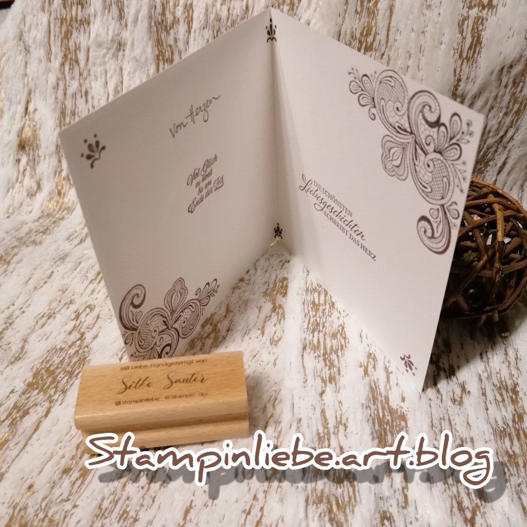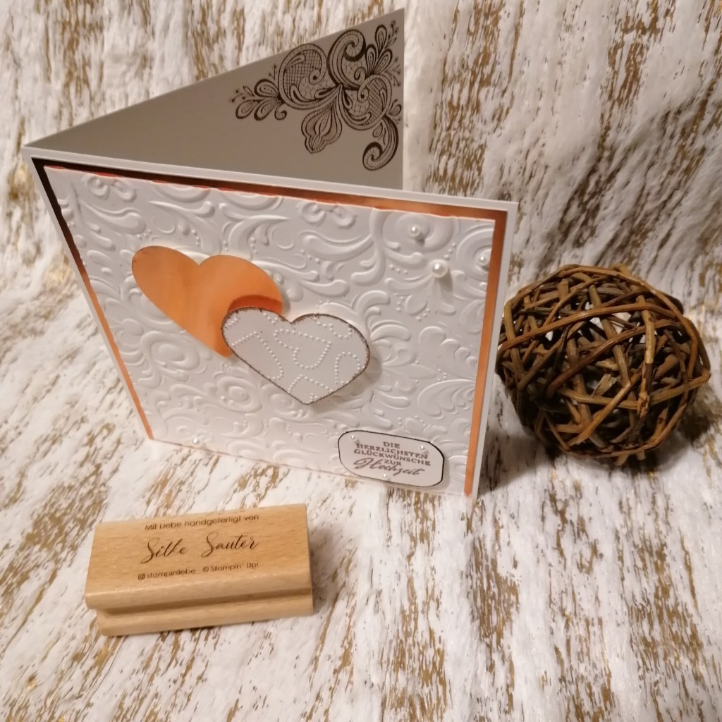 Heute habe ich mich mal für eine Quadratische Kartenform entschieden😘 Verwendet habe ich die Stempel-Sets „Feierliche Anlässe“, „Elegant gesagt“ und „Zauberhafte Grüsse“. Ansonsten habe ich noch die Handstanze aus dem Paket Herzen und für das Etikett die „Dekorative Details Trio-Stanze“ verwendet. An Prägeformen kamen „gepunktete Herzen“ sowie “ Pariser Schnörkel“ im Einsatz.Das eine Herz ist aus dem Metallic-Folienpapier in Kupfer ausgestanzt, zudem habe ich es auch für mein Passpartout verwendet. In Kontrast mit Grundweiss finde ich es sehr schön🥰. Das andere Herz habe ich mit den gepunkteten Herzen geprägt. Zudem in Versamark „gerollt“ und mit Kupfer embossed, wie auch der Spruch.Das Etikett habe ich in Espresso „gerollt“ um einen kleinen Kontrast zu erzielen. Das geprägte Passpartout habe ich noch mit Wink of Stella gesprenkelt. Noch ein paar Basic-Perlenschmucksteinchen dürfen nicht fehlen😉Innen habe ich in Espresso gestempelt, allerdings nur den zweiten Abdruck. Die Eckverzierungen des Sets Elegant gesagt finde ich richtig passend dazu.😊Neben den Sprüchen ist auch noch genug Platz für ein paar persönliche Zeilen😘
