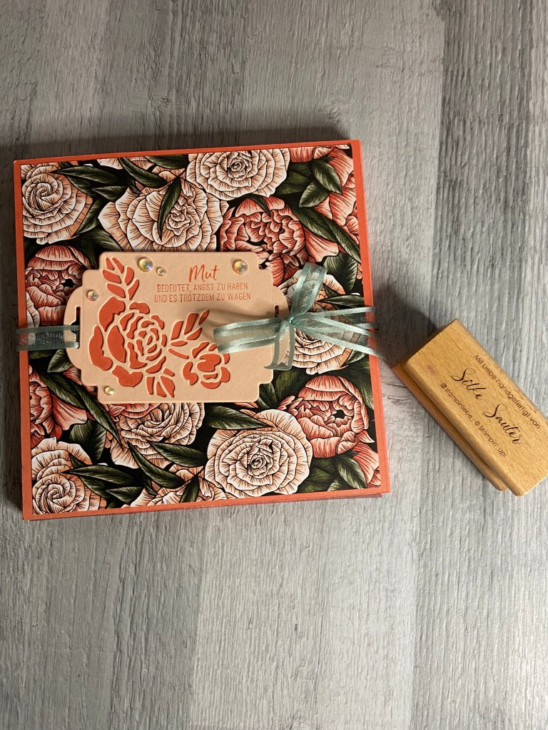 Ich habe mich gleich für zwei tolle Produkte aus dem neuen SAB entschieden. Zum einen das tolle DSP Beeindruckende Blumen und zum anderen das tolle Stempelset Mut und Glück. Dazu habe ich noch die Designeretiketten Stanzen genommen.Da bei einer sehr lieben Person eine große Veränderung ansteht, fand ich den Spruch dazu noch sehr passend😊Im inneren befindet sich noch, wie soll es anders sein🤭, leckere Schoki…Die Banderole ist in Calypso gehalten, was in Kombination mit dem DSP echt edel aussieht.Das Etikett habe ich zweimal ausgestanzt. Zum einen in Calypso zum anderen in Blütenrosa. Aus dem Blütenrosanen Etikett habe ich zusätzlich noch die Blume ausgestanzt und die Blüten etwas mit Wink of Stella ausgemalt, für den gewissenen Glitzer Effekt🥰 Das Etikett habe ich mit dem tollen Band in Seladon befestigt. Das ganze hab ich noch mit Buntem Schimmer Steinchen verziert und fertig ist es auch schon😘