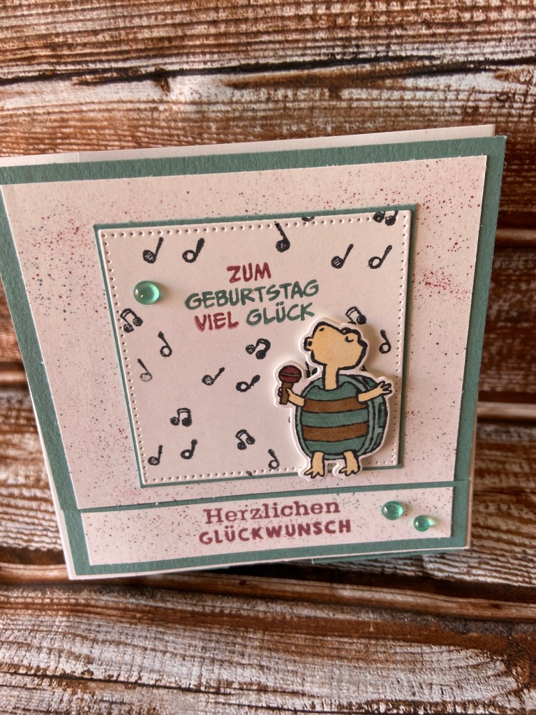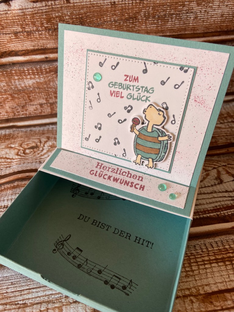 Die Box ist in Pfauengrün mit einer weißen Banderole in den Maßen 10x10x 2,5 cm, somit ist genug Platz für eine tolle Aufmerksamkeit. Sei es ein Schmuckstück, Geld oder Süssigkeiten, was man auch immer gerade verschenken möchte😉Benutzt habe ich die Stempelsets Zuckersüsser Zoo und Du Rockst. Ich liebe ja die kleine Schildkröte🥰Besprengelt habe ich in Malve und Pfauengrün mit den Stampin`Write Markern. Auch den Spruch habe ich mit ihnen coloriert. Die Schildkröte habe ich mit den Blends in Pfauengrün hell und dunkel sowie Elfenbein und Bronze colorie. Für das Mikrofon habe ich noch zusätzlich Malve dunkel verwendet. Der innen Bereich ist in Memento gestempelt.Den Spruch Herzlichen Glückwunsch habe ich in Malve gestempelt. Das ganze habe ich noch mit Flitter Schmucksteinen in Pfauengrün verziert. Natürlich habe ich die Schildkröte mit Dimensionales befestigt 😉Die Aussparung zum herausziehen habe ich mit der Handstanze Bestes Etikett ausgestanzt.Hier noch eine Seitenansicht😘