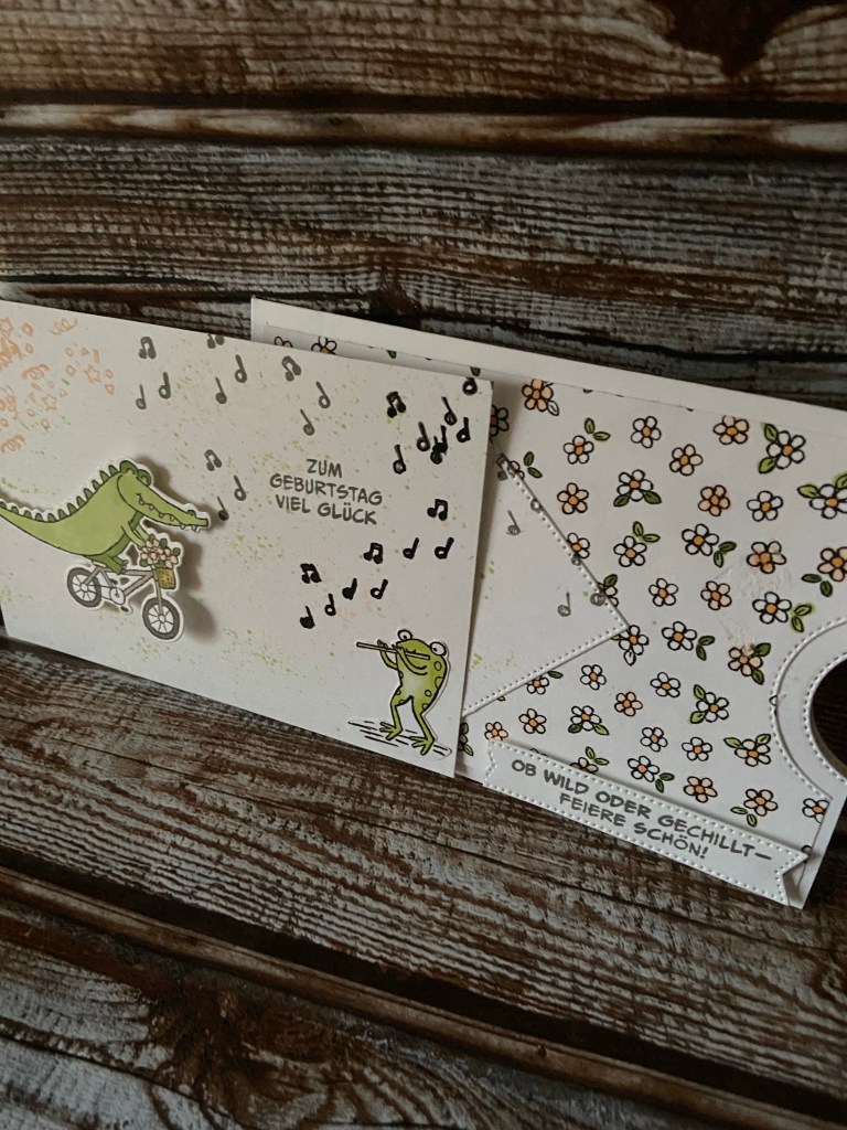 Die Grundkarte habe ich in Grundweiss gehalten ( 21x 14.85 cm. lange Seite bei 10 & 20 cm, eine kurze Seite bei 1 cm falzen= Umschlag). Mit dem zweit größten Kreis, aus dem Stanzset Basics mit Pep, habe ich die Lasche ausgestanzt. Das Krokodil habe ich in Memento aufgestempelt und mit Apfelgrün, Savanne, Kieselgrau und Blütenrosa ausgemalt. Die Blümchen, von dem DSP Party im Zoo, habe ich auch in Blütenrosa und Apfelgrün sowie Kürbisgelb ausgemalt.Den Spruch habe ich auch in Kieselgrau aufgestempelt. Das Quatrad habe ich noch mit ein paar Spritzer in Blütenrosa und Apfelgün gesprengelt und noch ein paar Noten aufgestempelt.Für die Innen Karte habe ich zusätzlich noch etwas Konfetti in Blütenrosa gestempelt und mit ein paar Apfelgrünen Spritzer dekoriert 🤭 Den süßes Frosch habe ich aus dem DSP ausgeschnitten und aufgeklebt.Die Magneten habe ich auf dem Krokodil angebracht. Wichtig!!! Bitte erst das Krokodil ( oder ein anderes Motiv ) platzieren und dann stempeln😘