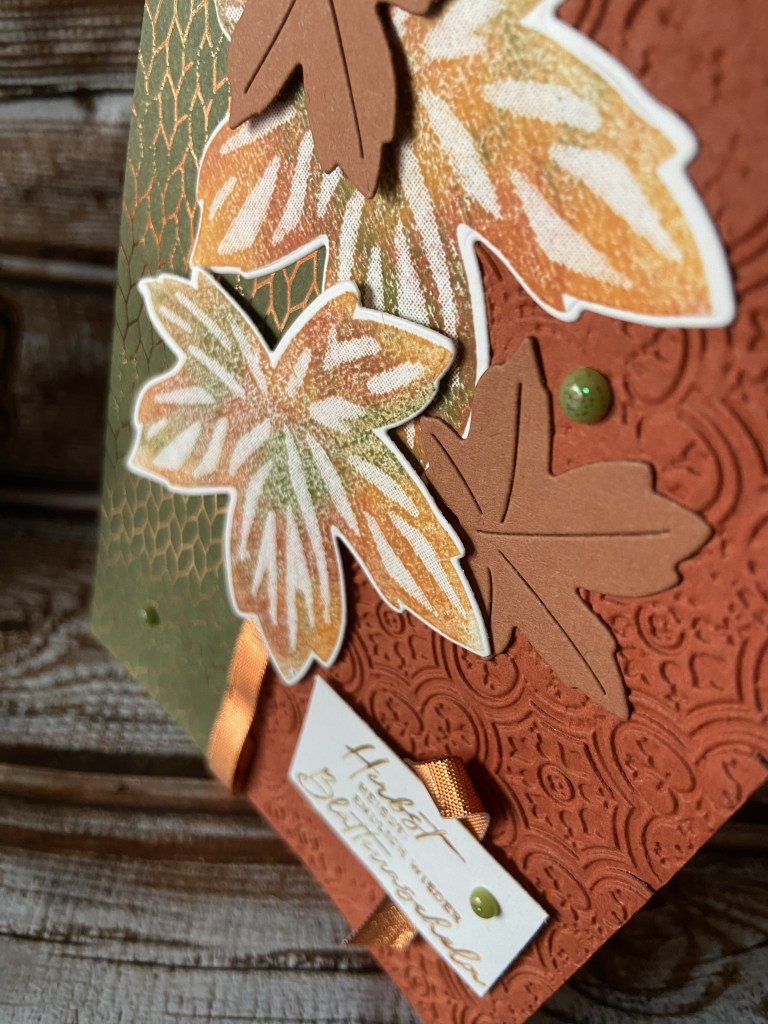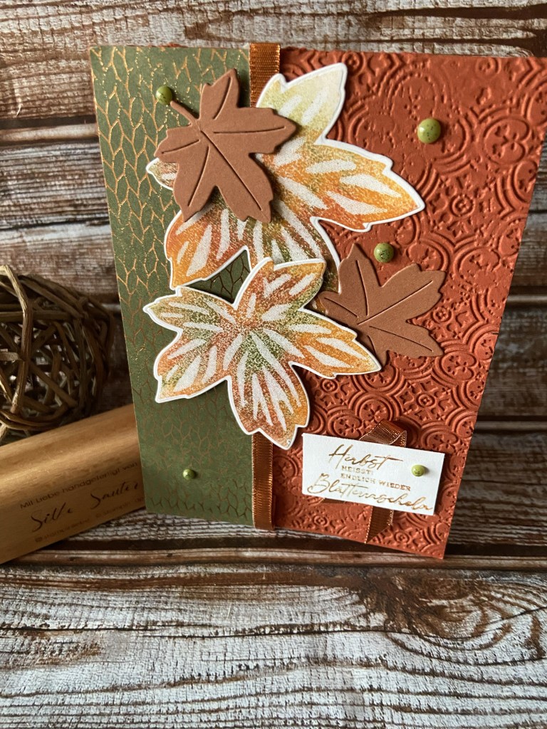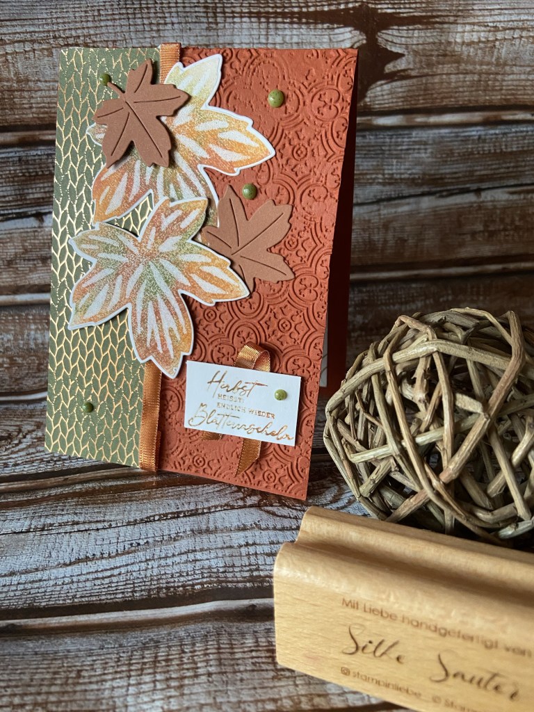 Bis auf Grundweiss und Terrakotta ist alles aus dem Set. Die Grundkarte habe ich zur Hälfte mit der 3D Prägeform Fliesen im Antik-Look geprägt. Der Streifen DSP zur Hälfte mit dem passenden Kupferband umlegt und angeklebt.Die Blätter habe ich mit der Wipe Technik in Terrakotta, Waldmoos und Kürbisgelb gestempelt und ausgestanzt. Dazu noch zwei kleine Blätter in Kupferbraun ausgestanzt und teils mit Tombow und Dimensionales aufgeklebt.Den Spruch habe ich auf die selbe Weise gefärbt und gestempelt. Mit ner kleinen Schleife aus Kupferband hinterlegt und ebenfalls mit Dimensionales angebracht.Für das Innere habe ich auch wieder die gleiche Farb und Stempeltechnik verwendet.Zu guter letzt noch ein paar gesprenkelte Akzente in Waldmoos angebracht und fertig ist meine Goldener Herbstkarte.