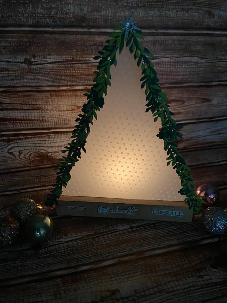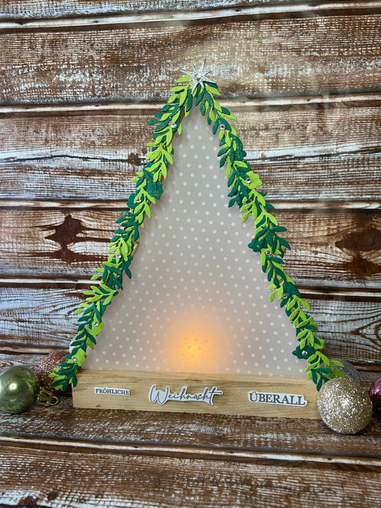 Ich habe dieses süße Dekobäumchen gewerkelt. Das Grundgestell sind „Umrührstäbchen“, die ich zusammengeleimt habe. Das wiederum an den kleinen Halter geklebt wurde.Verkleidet habe ich mit dem Besonderen DSP Pergament Basic. Natürlich steht keine richtige Kerze dahinter, sondern ein Teelicht mit Batterien😉 ( Brand Gefahr)Den Spruch habe ich aus dem Set Feiertags-Klassiker, das ich bei unserem letzten Teamtreffen gewonnen habe, mit Versamark aufgestempelt und in Silber Embossed. Wie auch den Stern an der Spitze, der aus dem Stanzset Nacht voller Sterne stammt. Den Spruch habe ich noch mit Mini Klebepunkten und Dimensionales befestigt.Die Blätter habe ich in in Olivgrün und Tannengrün mit den Stanzen aus dem Set Papierkranz, ausgestanzt und aufgeklebt. Mit Wink of Stella und ein paar Basic Schmucksteinchen verziert.Und so sieht es im Dunkeln aus😘