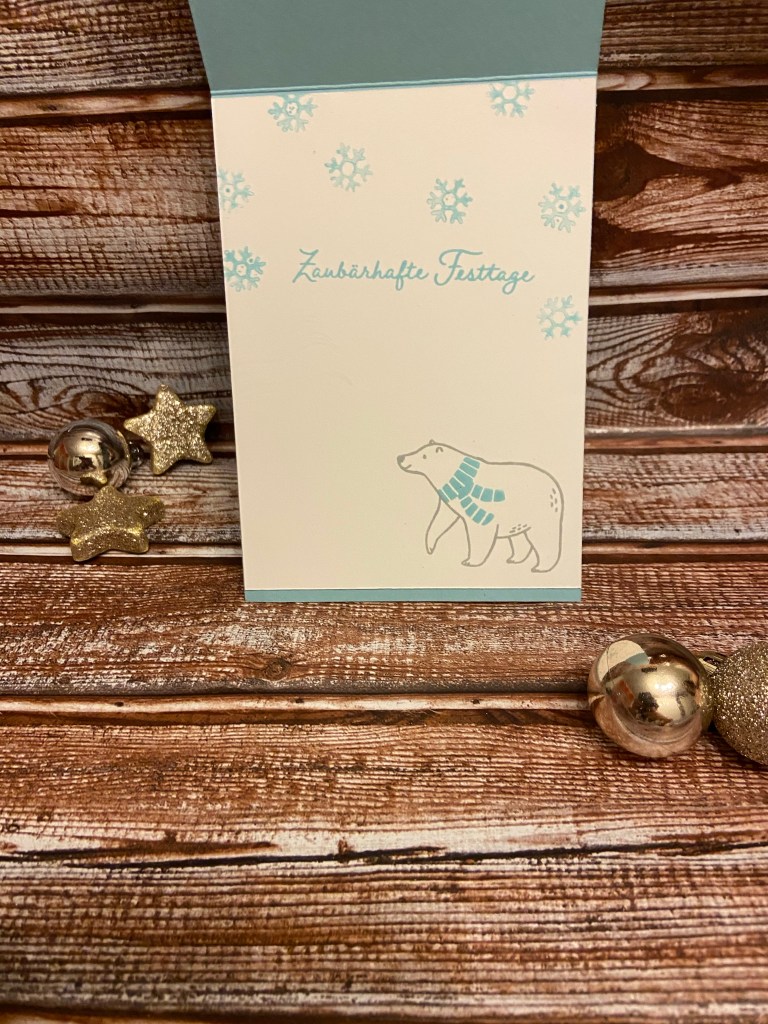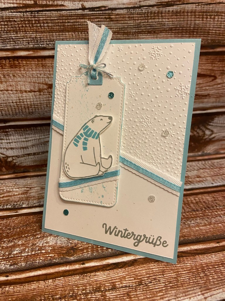Ich habe eine „Bärige“ Weihnachtskarte im Gepäck😘ich finde die Tierchen einfach toll😍Die Grundkarte ist in Babyblau. Hinzu kommt der Passepartout in flüsterweiß, den ich schräg mit der 3 D Prägeform geprägt habe. Um den Effekt besser zu betonen, habe ich den Übergang von geprägt zu nicht geprägt, mit dem doppelt bestickten Geschenkband in Babyblau und Weiß umwickelt. Den Spruch habe ich in Schiefergrau gestempelt.Innen habe ich den Spruch in Babyblau und den Bären in Schiefergrau gestempelt. Noch ein paar Babyblaue Flocken durften auch nicht fehlen🤭Mit den Anhängern nach Mass habe ich den Aufleger gestaltet. Auch hier habe ich das Geschenkband für, den Hinschauer, verwendet😊 Natürlich habe ich beide Karten mit Wink of Stella, sowie den Aufleger zusätzlich mit dem Wassertankpinsel und Babyblau besprenkelt. Den Bären habe ich mit der Schere ausgeschnitten😘Zum Schluss noch ein paar selbstklebende Glitzer Pailletten in weiß und Babyblau aufgeklebt und ….. tata… fertig ist die Weihnachtskarte.😃🎅🏻