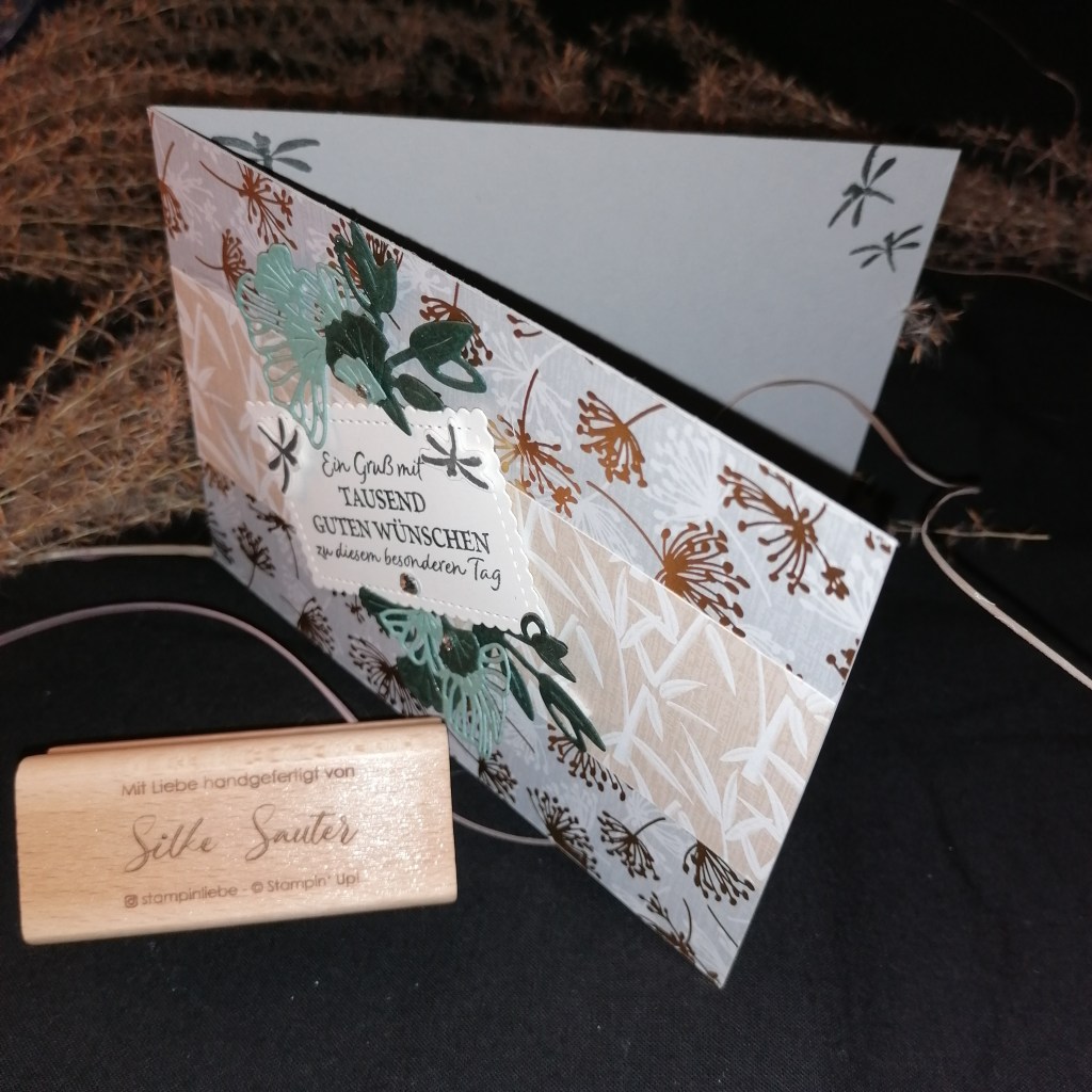 Die Karte ist in Grundweis 21 x 14,85 cm, gefalzt bei 10,5. Das DSP Glückssymbole 14,85 x 10,5 cm und 14,85 x 4,5 cm.Das Etikett ist aus dem Stanzen Set so Hübsch Bestickt und in Anthrazitgrau bestempelt. Die Libellen sind auch in Anthrazitgrau gestempelt, ausgestanzt und mit Dimensionales aufgeklebt. Die Blätter sind in Lodengrün und Seladon ausgestanzt. Zudem haben die Lodengrüne Blätter einen hauch Glitzer mit Wink of Stella bekommen.Im Innen Teil habe ich auch noch Libellen aufgestempelt und Blätter. Genug Platz für eine Persönliche Widmung ist natürlich😘Den Kranich habe ich mit einem Aquarellstift in der Farbe Calypso und dem Wassertankpinsel etwas eingefärbt. So erhält die Karte noch einen kleinen Farbtupfer 😊 Noch mit ein paar Strasssteinchen verzieren und fertig ist die Geburtstags oder Jubiläumskarte. Die Karte passt zu einigen besonderen Anlässen mit diesem schönen Spruch.