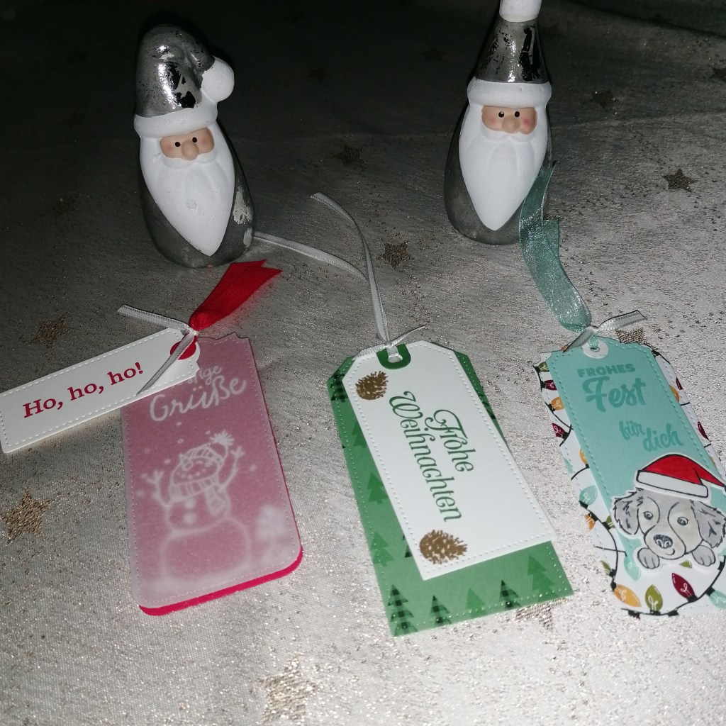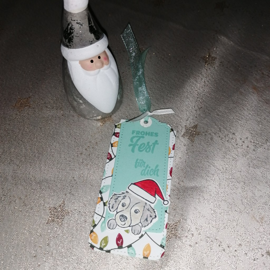 Alle drei wurden mit den Stanzen aus dem Stanzset Anhänger nach Maß ausgestanzt.Dieser Anhänger ist in Glutrot auf den ich den Spruch und den Schneemann in weiß embossed habe. darüber habe ich das Schimmernde Pergament gelegt. Noch ein kleineren Anhänger mit HoHoHo 🎅 und das ganze mit Glutrotem Band zusammen gebunden. Fertig😊Für diesen Anhänger habe ich als Grundlage das DSP aus der letzten Sale a-bration verwendet. Natürlich kannst Du auch jedes andere nehmen was Dir gefällt😘. Passend dazu das Stempelset Tannen und Karos verwendet. Gestempelt ist in Wildleder und Gartengrün.Fertig ist auch dieser😘Nun der letzte im Bunde und mein kleiner Liebling 🥰. Grundanhänger ist aus dem DSP Festliche Strümpfe, der kleinere in Aquamarin. Auf den kleineren habe ich noch einen Hundekopf aus dem Set Festliche Strümpfe gestempelt, ausgestanzt und mit Blends verschönert. das gleiche mit der Mütze. Der Spruch ist auch aus dem Set Festliche Strümpfe😉 Und fertig ist auch dieser🤩