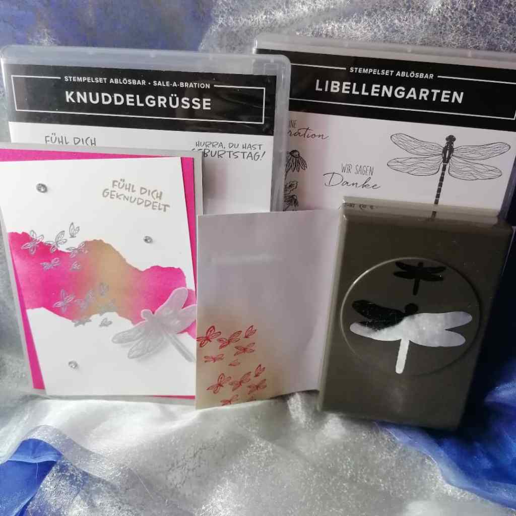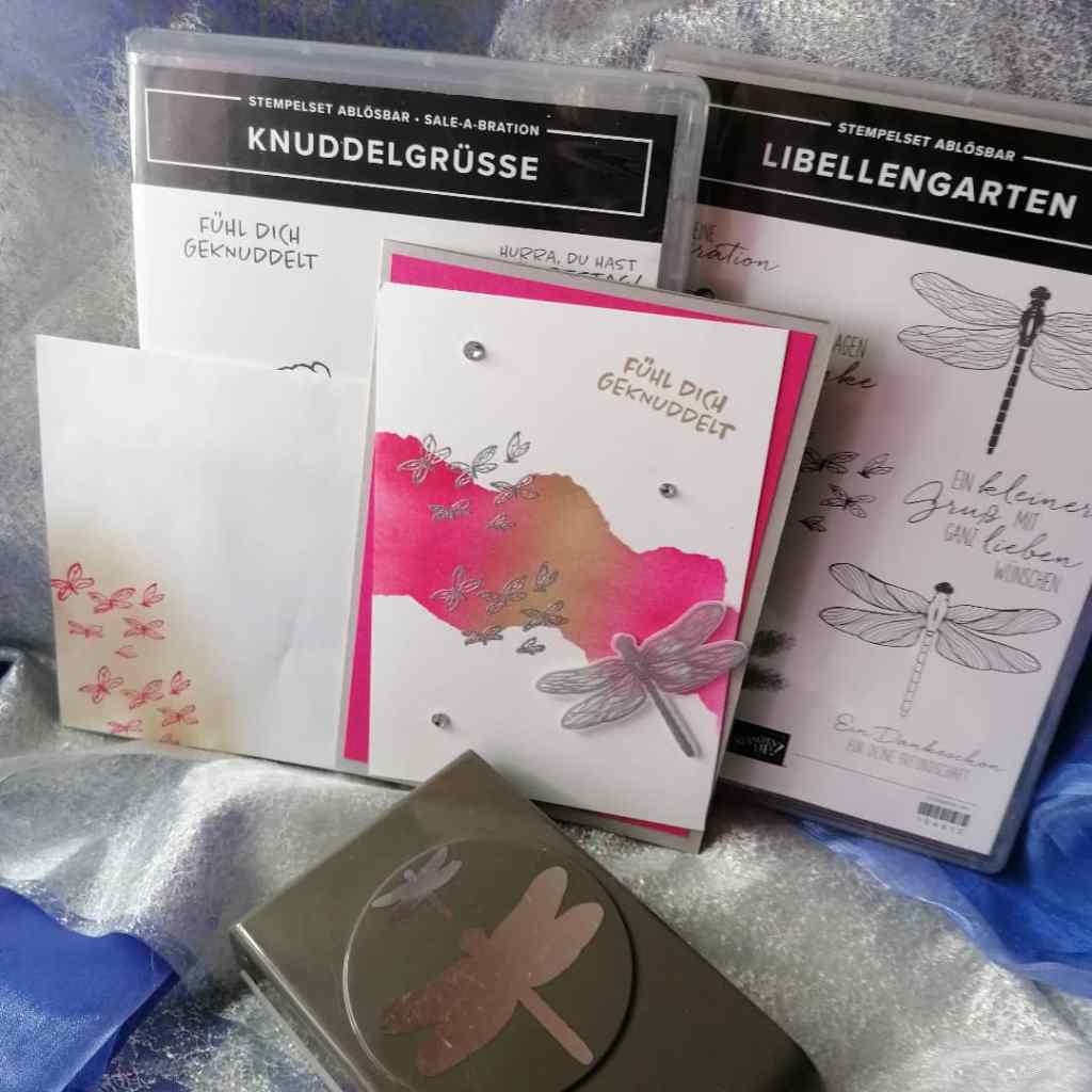 Die Grundkarte in Schiffergrau hat die Maße 14,85 x 21 cm und ist bei 10,5 cm gefalzt. Der Aufleger ist in Wassermelone mit den Maßen 13,85 x 9, 5 cm und schräg aufgeklebt. Darüber noch ein Stück Flüsterweiss in 12.85 x 8,5 cm. Natürlich kannst du die Maße bei den Aufleger verändern, ich wollte das etwas mehr Farbe zu sehen ist☺️Für den Farbverlauf habe ich ein Stück Papier, Du kannst auch ein Stück Cardatock nehmen, „zerrissen“ und mit „Whasi-Tape“ fixiert. Dann mit den Blending Pinsel einmal in Wassermelone und danach in Savanne gefärbt. Mit Versamark habe ich die Schmetterlinge aufgestempelt und in Silber Embossed. Den Spruch noch in Savanne, aus dem Stempelset Knuddelgrüße, aufgestempelt und schon hast Du es fast geschafft😘Die Libelle, aus dem Stempelset „Libellengarten“ habe ich auf Pergament mit Versamark gestempelt, in Silber Embossed und mit der Handstanze Libelle ausgestanzt. Dimensionales angebracht und auf die Karte geklebt. Noch ein paar Strasssteinchen und fertig🤗 Natürlich habe ich auch hier wieder im Innenteil ein paar Schmetterlinge aufgestempelt und den Umschlag dazu passend gestaltet😉
